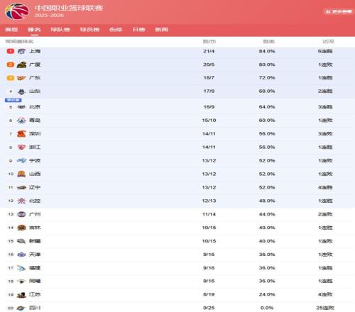 上海和广厦依旧在纠缠,上海21胜4负位列第1,广厦20胜5负排名第2,本赛季谁会是联赛第1,这个结果还真不好说!
