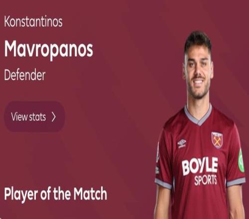 头球破门+10次解围,马夫罗帕诺斯当选西汉姆11曼城全场最佳